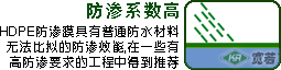 防滲系數(shù)高— HDPE土工膜具有普通防水材料無法比擬的防滲效果,水蒸汽滲透系K<=1.0*10-13 cm/(cm2·s·Pa)。