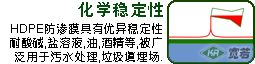 化學(xué)穩(wěn)定性— HDPE土工膜具有優(yōu)異的化學(xué)穩(wěn)定性,廣泛用于污水處理,化學(xué)反應(yīng)池,垃圾填埋場。耐高低溫,耐瀝青,油及焦油,耐酸、堿、鹽等80多種強(qiáng)酸強(qiáng)堿化學(xué)介質(zhì)腐蝕。